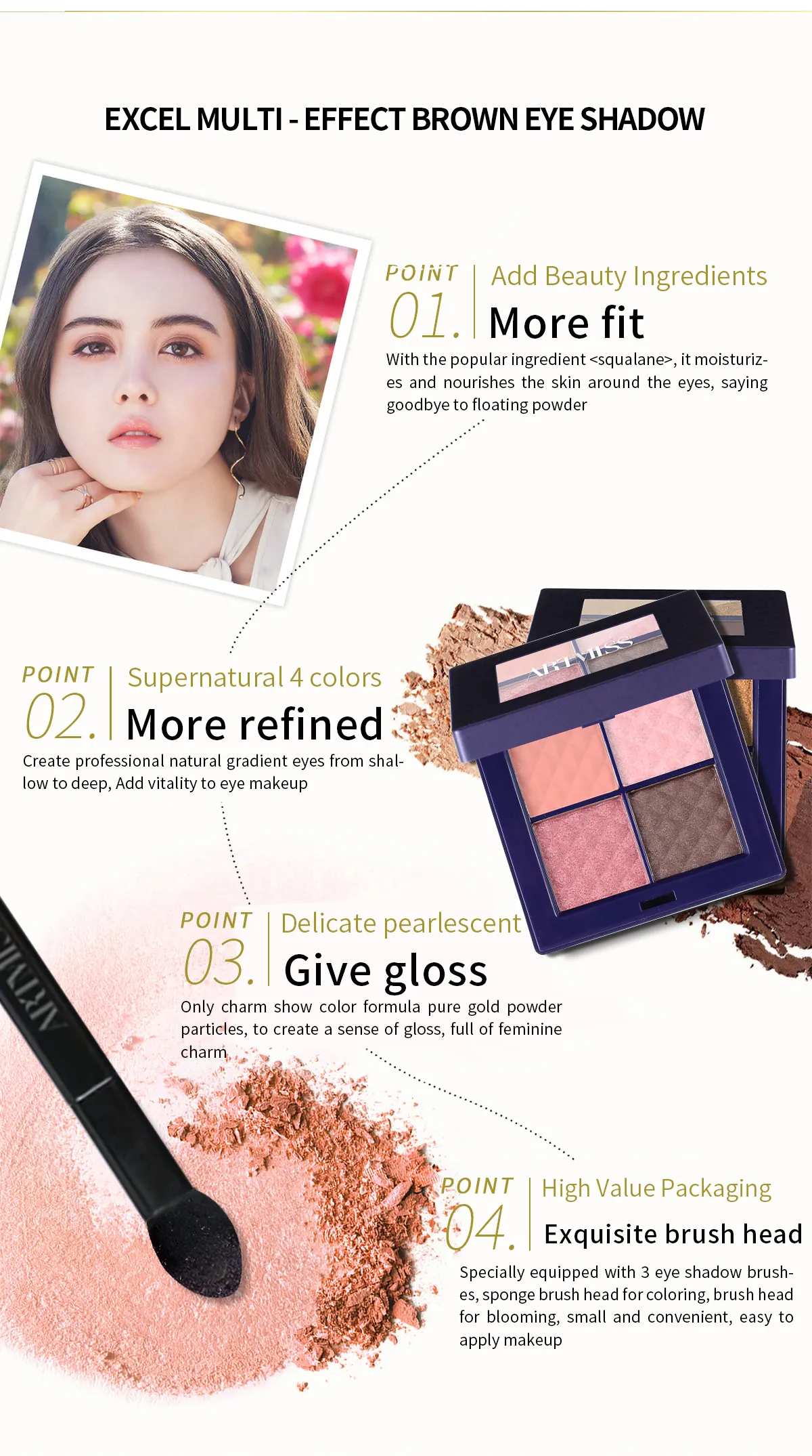 Quick DetailsUse:EYEType:eye shadowIngredient:MineralForm:PowderEye Shadow Type:dryFinish:RADIANT, SHIMMER, MATTE, NaturalSingle color/multi-color:four colorsFeature:waterproofCertification:MSDS, SASO, GMP, MSDSPlace of Origin:GuangzhouBrand Name:ARTMISSProduct Name:Charming Four Colors Eye ShadowCo......